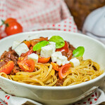 Zutaten (4 Portionen) 500 g Tomaten (in der Saison gerne frisch, sonst gestückelt aus der Dose) 2 bis 3 Knoblauchzehen 1 rote Zwiebel 1/2 Chilischote, 2 EL Pesto rosso, etwa 75 ml Rotwein, 1 EL Tomatenmark, etwas Olivenöl, Thymian, Oregano, Paprikagewürz, Salz und Pfeffer. Außerdem zum Servieren eine halbe Kugel Mozzarella eine Handvoll Kirschtomaten und etwas frischen Basilikum Zubereitung Knoblauch schälen und klein schneiden, ebenso die Zwiebel. Chili in Streifen schneiden. Topf aufsetzen und sobald er warm ist, das Olivenöl dazu geben. Anschließend die Zwiebelnwürfel andünsten, bis sie glasig sind. Knoblauch und Chili kurz mitbraten, dann mit Rotwein ablöschen. Nach etwa drei Minuten mit den Tomaten auffüllen. Mit Pesto und...