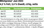 Wie schon im April und im Mai ist der BWagrar Milchpreis im Juni nochmals um zwei Cent gefallen auf nun 45,3 Cent pro kg. Der BWagrar Biomilchpreis blieb im Juni unverändert bei rund 56,0 Cent pro kg Milch. Der Kieler Rohstoffwert erhöhte sich im Juni um 0,6 Cent pro kg auf 37,0 Cent pro kg. Das könnte ein erstes Zeichen sein, dass der Preisrückgang bei der Milch bald gestoppt wird. In der 26. Woche ging die erfasste Milchmenge laut Schnellberichterstattung der ZMB gegenüber der Vorwoche saisonbedingt zwar um 0,4 Prozent zurück. Der Zuwachs gegenüber der Vorjahreswoche lag aber immer noch bei 2,2 Prozent. Damit sind die Milchmengen nach wie vor zu hoch. Das Angebot an flüssigem Rohstoff hat laut ZMB etwas zugenommen. Die Preise für...