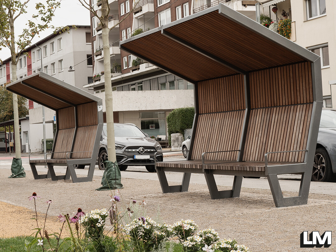 Die Bankpergola Bremerhaven vereint Schutz vor Sonne und vor Witterung und dient zugleich als funktionaler Raumtrenner, um vor störenden Einflüssen, wie Straßenlärm, abzuschirmen - ein multifunktionaler Blickfang, für eine höhere Aufenthaltsqualität im urbanen Raum.
