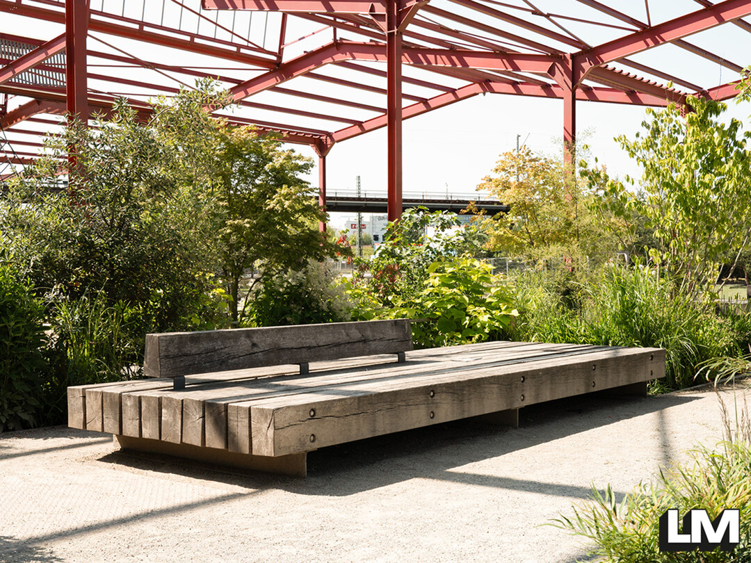 Durch lange Eichenbohlen, die an Eisenbahnschwellen erinnern, schafft das Quartierspodest am alten Güterbahnhof in HH-Altona ein wirkungsvolles Ambiente und gestaltet eine einladende Umgebung, die Raum für Miteinander schafft und zum Austausch einlädt – LM.