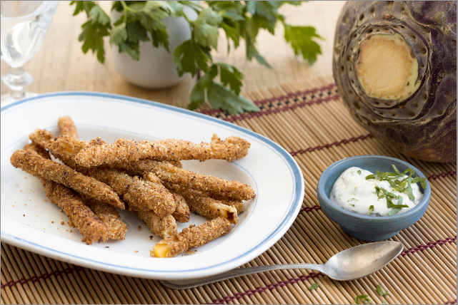 4. Die gebackenen Steckrübensticks auf einem Teller anrichten, die Sauce separat  geben.