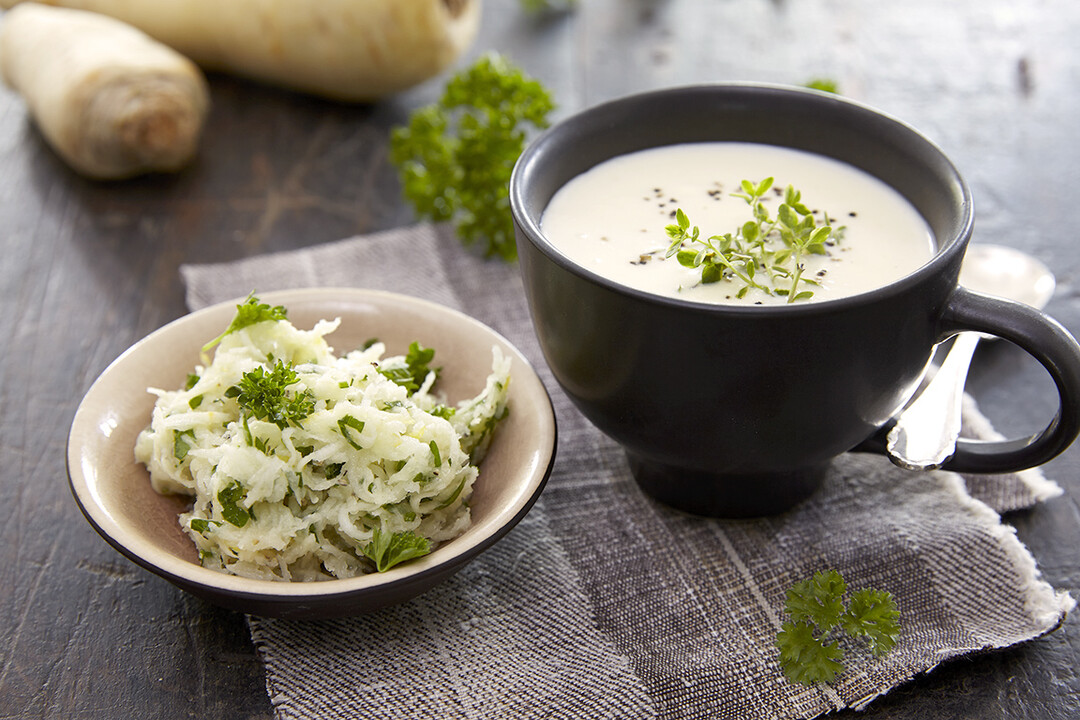 Rezept-Tipp: Petersilienwurzelsüppchen mit Petersilienöl und Pastinaken-Waldhonigsalat