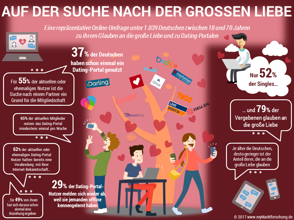 Das Institut myMarktforschung.de hat im Rahmen einer repräsentativen Umfrage im Januar 2017 1039 Deutsche zwischen 18 und 70 Jahren online zum Thema Liebe befragt und wie sie zu der Nutzung von Dating-Portalen stehen. Untersucht wurde unter anderem, welche Dating-Portale genutzt werden, aus welchen Gründen die Nutzer sich dort angemeldet haben und wie viele Dates und Beziehungen dabei entstanden.