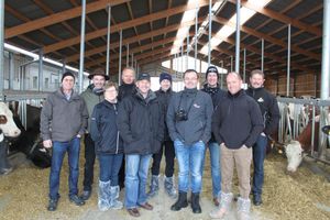 Bauern aus Luzern im Milchviehstall: (vorne l.) Beat Fuchs, Vreny Müller, Landwirt Hans-Georg Schwarz, Geschäftführer Stefan Heller, Präsident Jakob Lütolf, (hinten l.) Joe Schnider, Wendelin Emmenegger, Ivo Wolfisberg, Thomas Oehen und Tony Kaufmann Amstutz
