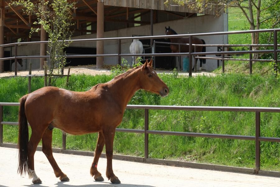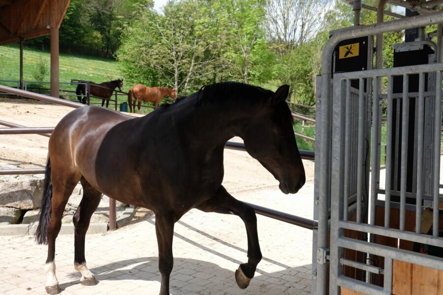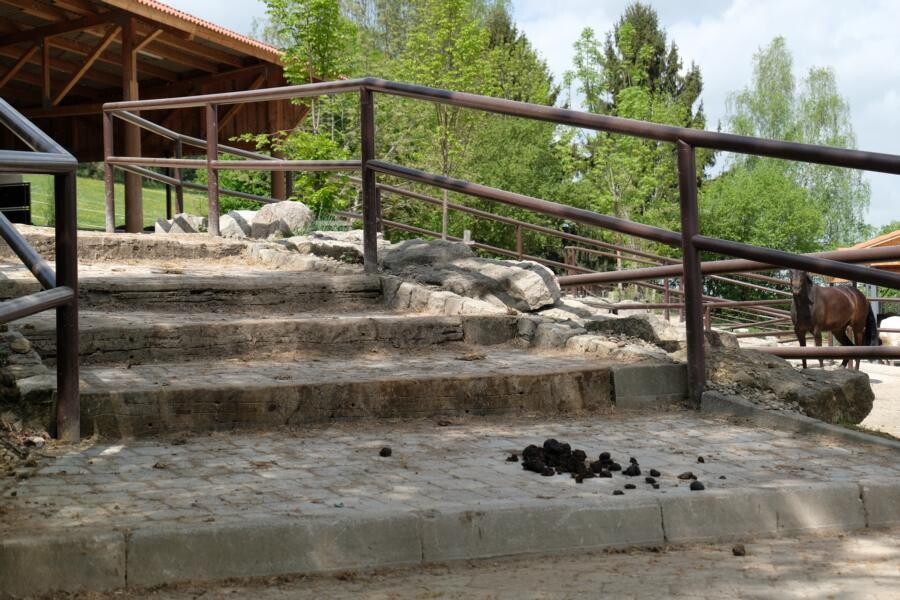Nach Passieren der Kraftfutterstation müssen die Pferde eine kleine Treppe überwinden, um zurück zu den Liegeflächen zu kommen. Das Einbahnsystem bedingt eine Wegstrecke von rund3,6 Kilometer, die die Tiere am Tag mindestens zurücklegen.