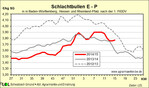 So kletterte das Preisniveau für Schlachtbullen (E-P) in Baden-Württemberg, entgegen dem saisonalen Trend, auf 3,90 Euro/kg SG (KW 7) und konnte sich dort bis Anfang März halten. Zwar blieben die Stückzahlen auch für den restlichen Monat überschaubar, dennoch zeigte sich der Markt gut versorgt und die jahreszeittypischen Preisschwächen setzten sich durch. Doch das Osterfest mit einer verstärkten Nach-frage nach Edelteilen lieferte erneut positive Impulse. So konnte in KW 15 mit 3,77 Euro/kg SG wiederum ein leicht höheres Preisniveau umgesetzt werden. In den kommenden Wochen ist jedoch mit einer verstärkten Nachfrage nach Grillartikeln und einer entsprechenden Verschiebung vom Rindfleisch- hin zum Schweinefleischsortiment zu rechnen. So wird sich die rückläufige Preiskurve langfristig gesehen wohl weiter fortsetzen.