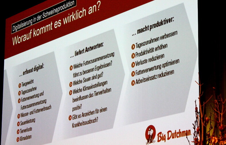 Digital erfasst werden in der Schweinehaltung das Tiergewicht, die Tageszunahmen, die Futterverwertung und Zusammensetzung, Wasser- und Futterbrauch, Sauenleistung, Tierverluste und Klimadaten. Ziel sei es, die Produktivität durch Zunahmen und eine bessere Futterverwertung zu steigern und gleichzeitig Tierverluste und den Arbeitseinsatz zu reduzieren. Am meisten Erfahrung gebe es mit den Futterdaten. Über Sensoren und Tabellen wird hier der Wachstumsverlauf der Tiere festgehalten und das Futter entsprechend dosiert. Ferkelaufzucht und Mast würden zunehmend separat betrachtet. An Hand der Daten wird die Rückverfolgbarkeit erhöht. So können die Abnehmer entlang der gesamten Kette informiert werden, vom Stall bis zum Teller. „Das schafft Vertrauen“, findet Holling. Doch werden die Verbraucher mit zu vielen Informationen nicht auch verunsichert? „Das ist sicher so. Da muss man gut aufpassen“, rät Holling.
