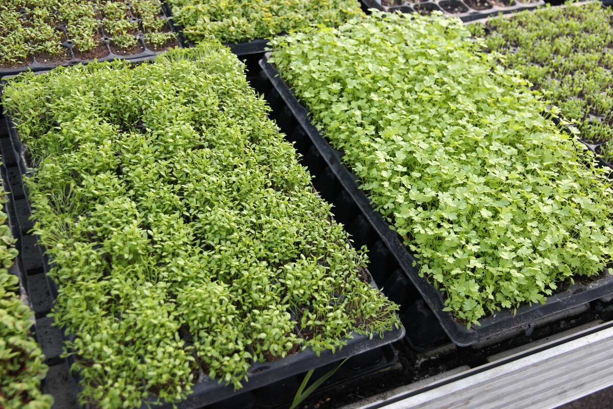 Eines Tages machte ein langjähriger und immer wieder ideenreicher Mitarbeiter den Vorschlag, Gerstengras als Kultur zu versuchen; sie hat einen großen Gesundheitswert. Über diese Kultur entwickelte sich der Zugang zum veganen Markt, bis dahin für die Unternehmerin eine fremde Welt. Damit holte sie sich allerdings auch ganz neue Kulturherausforderungen ins Haus, denn für vegan erzeugte Kräuter kommen organische Dünger, die sonst im Bioanbau beliebt sind, nicht infrage – „ein Kunde, der einen veganen Kräutertopf kauft, will sich damit ja nicht eine halbe Kuh mit ins Haus holen", bringt es Tanja Dworschak auf den Punkt. So stellte sie für die Pflanzenernährung auf Rüben-Vinasse um. Problematisch an diesem Produkt ist allerdings, dass es für Trauermücken ideale Bedingungen schafft. So laufen im Betrieb Versuche mit neuen veganen Düngern auf Aminosäurebasis. Wie schon die Vinasse werden auch diese neuen Produkte nicht dem Substrat beigemischt, sondern als Punktdüngung bei der Aussaat ausgebracht. Die Ergebnisse sind sehr vielversprechend, eine trauermückenfreie Kultur scheint möglich zu sein. Auch mit Effektiven Organismen gibt es gute Erfahrungen in der Gärtnerei. Deren Wirksamkeit erklärt sich die experimentierfreudige Unternehmerin mit der spielerischen „Reise nach Jerusalem", bei der immer ein Stuhl weniger zur Verfügung steht als es Teilnehmer gibt: „Wo gute Mikroorganismen die Plätze besetzen, haben schädliche keine Chance."