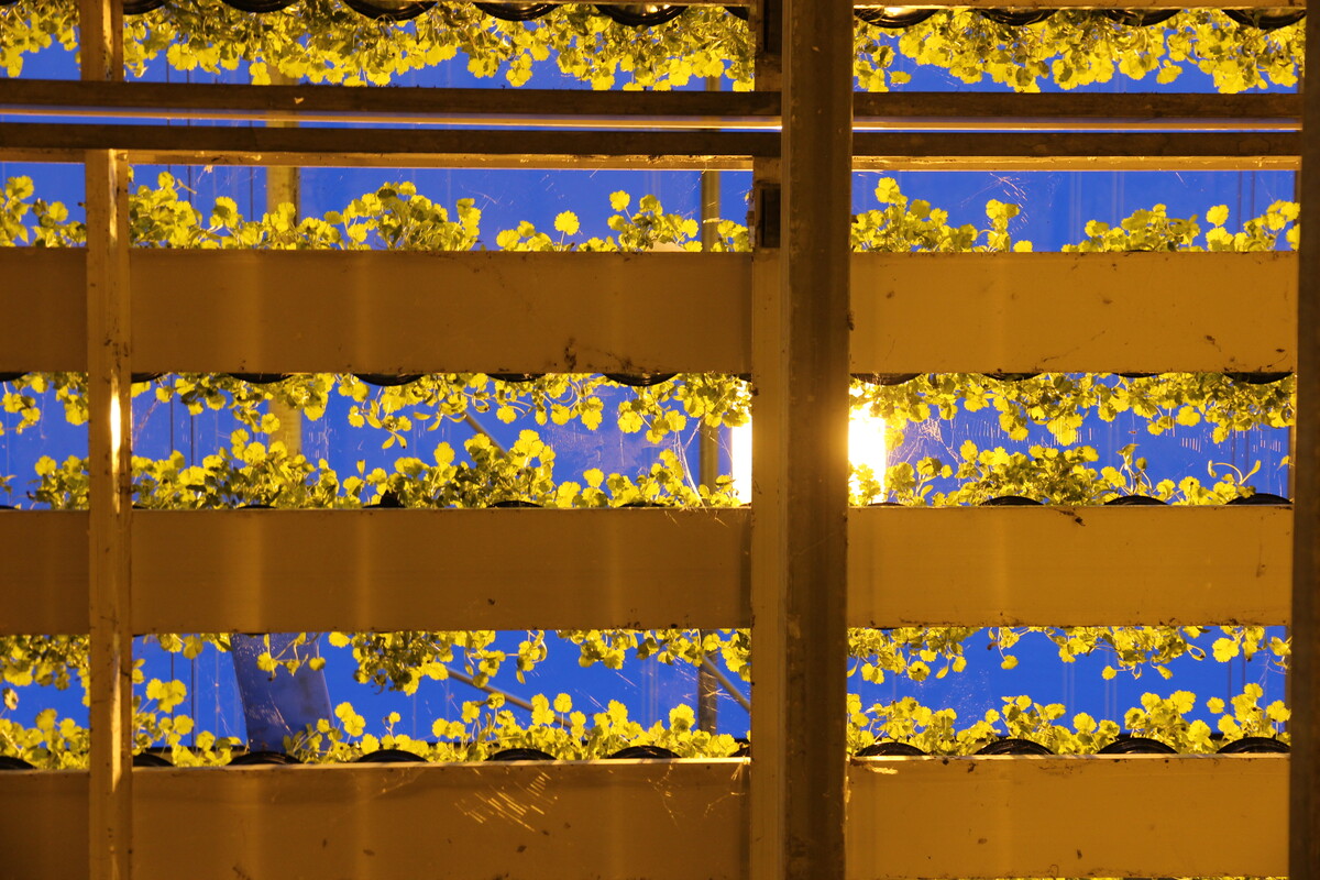 Die erste Doppelstockanlage wurde bereits 2010 gebaut, sie steht im älteren Betriebsteil. Die Anlage ist in sich geschlossen und komplett automatisiert. Die EDV ist sehr leistungsfähig und steuert die Produktionsabläufe insbesondere mit den nötigen Verweilzeiten für die mit frischen Aussaaten belegten Tische im Keimraum. Rucola beispielsweise läuft schon nach einem Tag auf, bei Petersilie dauert es neun Tage. Das System optimiert im Blick darauf die Einlagerung im Keimraum. Ganz allein geht das freilich nicht – eine Mitarbeiterin betreut das technische System schon seit Jahren, sie hat dafür eine besondere Begabung. Durch die Automatisierung ist der Arbeitsbedarf in diesem Bereich auf fast nur noch ein Viertel von einst zurückgegangen.