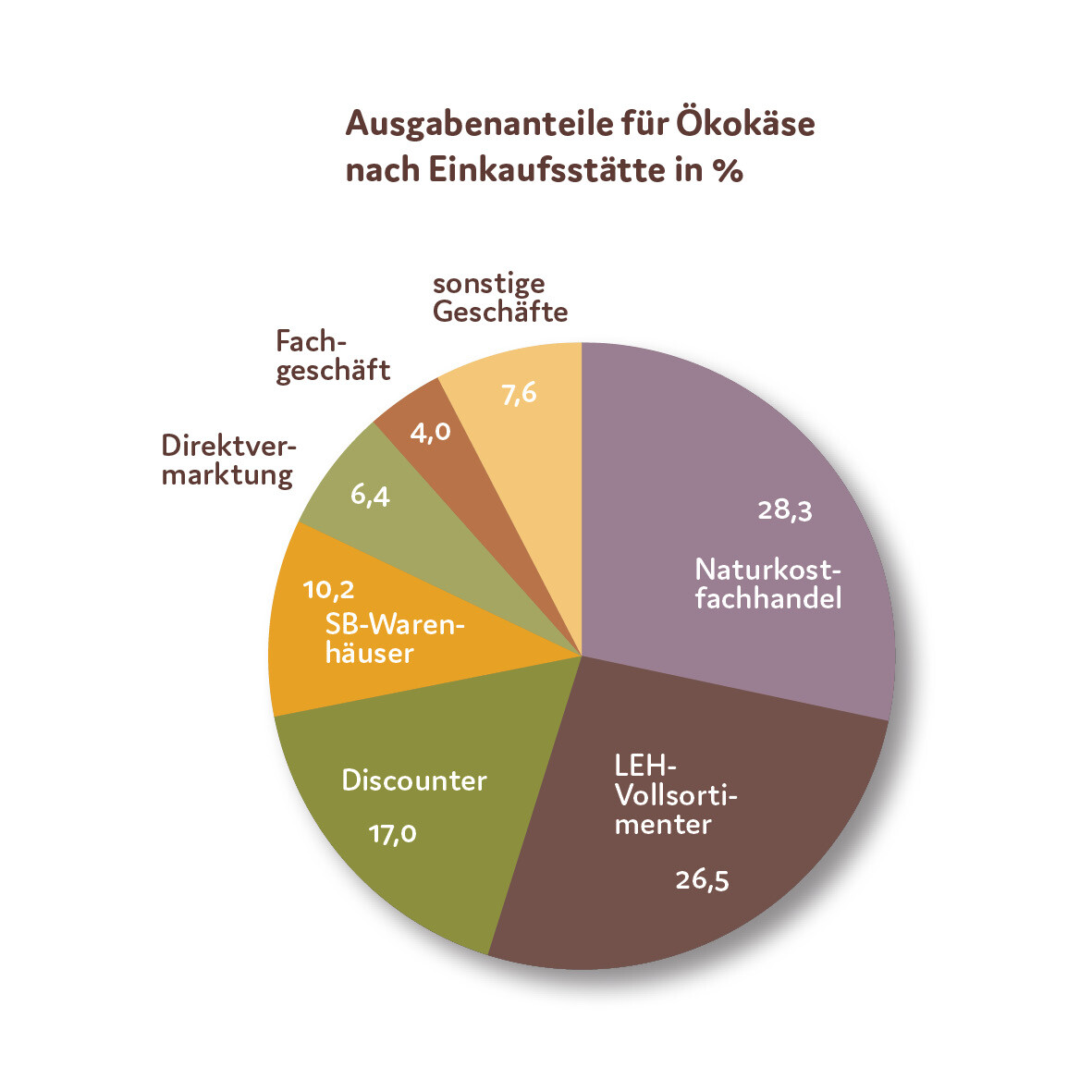 Dennoch gaben die Kunden im herkömmlichen LEH 54 % der Gesamtausgaben für Ökokäse aus: 27 % in LEH-Vollsortimentern, 17 % in Discountern und 10 % in Selbstbedienungswarenhäusern. Die beliebteste Einkaufsstätte für Ökokäse war der Naturkostfachhandel. 28 % der gesamten Ausgaben für Biokäse ließen die Kunden dort. In der Direktvermarktung und im Fachhandel gaben die Verbraucher mit 6 % und 4 % deutlich weniger aus.