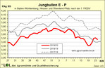 Die Rindfleischpreise tendieren derzeit insgesamt fester, wobei weibliche Tiere mehr gefragt sind als Jungbullen. Zwar wird auch hier vom Norden und aus Bayern von steigenden Forderungen in Folge geringer Stückzahlen berichtet, im Südwesten zeigen die Schlachtunternehmen allerdings nur wenig Bereitschaft höhere Preisforderungen zu erfüllen. In der Kalenderwoche 24 wurde von den preismeldepflichtigen Schlachtbetrieben im Südwesten für 2.250 Jungbullen im Schnitt der Handelsklassen S-P 3,47 Euro/kg SG bezahlt.