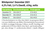 Im Dezember hat sich der gewichtete monatliche BWagrar Durchschnittspreis für Milch von 39,4 Cent um 0,2 Cent auf 39,6 Cent pro kg gegenüber November weiter erhöht. Im arithmetischen Mittel sind es mit 39,7 Cent pro kg (November: 39,3 Cent) knapp 0,4 Cent mehr.