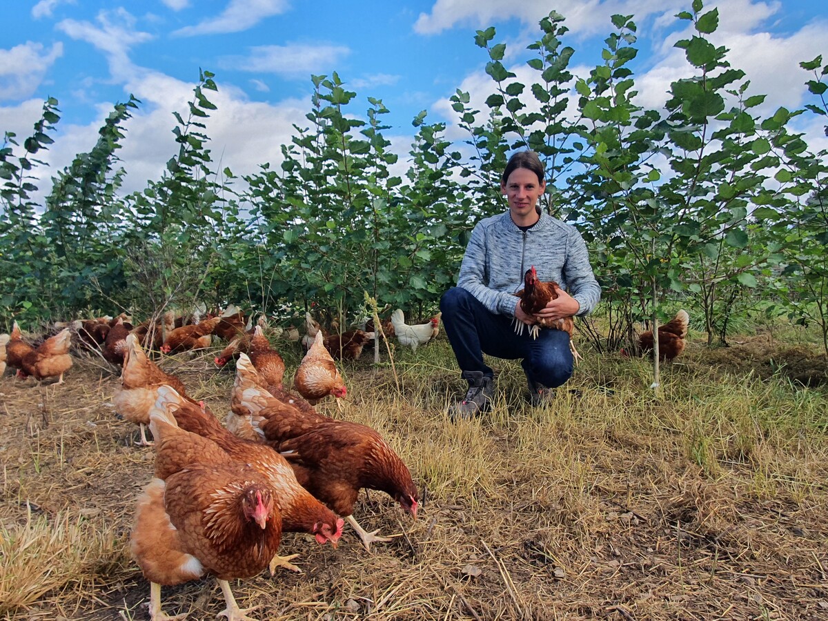 Inwischen ist die Agroforstfläche auf sieben Hektar angewachsen. Auf etwa 25 % der Fläche stehen Bäume, davon 70 % Pappeln. Jeder der sechs Mobilställe mit je 1000 Hühnern verfügt über drei Parzellen. Wenn eine Parzelle für zwei bis vier Monate leer steht, wird dieser Zeitraum genutzt, um das Gras nachzusäen und Pappeln nachzupflanzen (aktuell die Sorte 'Max3'). Ehe die Hühner wieder auf die Fläche gelassen werden, müssen die Pflanzen so hoch wachsen, dass die Vögel die Triebspitzen nicht mehr erreichen.