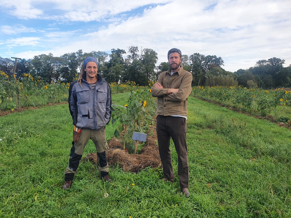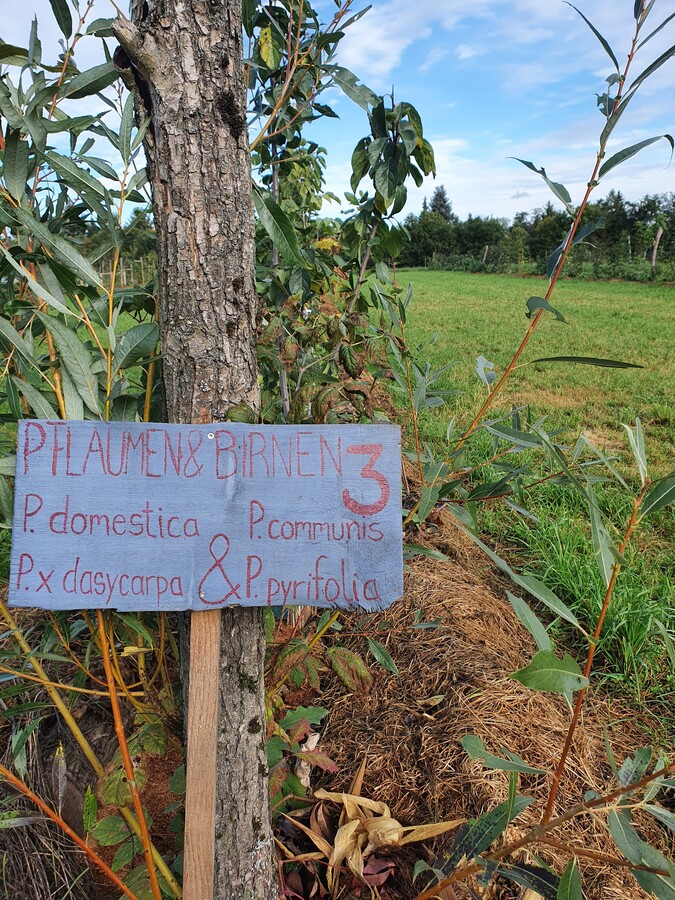Während ich mich in einem seiner noch jungen Agroforstsysteme umsehe, bemerke ich, dass das zwar pathetisch klingt, aber keineswegs nur so dahergeredet ist. Der Acker ist eine Ode an die Vielfalt. Die Blüten von Malven, Sonnenblumen, Beinwell, Fetthenne und Physalis leuchten an diesem sonnigen Oktobertag. Dazwischen verfärben sich die ersten Blätter der Obstbäume und Pappeln. Bösel beginnt, einige der 1900 Pflanzen, die hier in 19 Reihen wachsen, aufzuzählen: „17 Pflaumensorten, vier Birnensorten, Maulbeeren, Goji, Sanddorn, Feigen, Brombeeren, Radieschen und dazwischen Kräuter.“ Das Ziel war eine große Diversität, die den Insekten das ganze Jahr über viele Blüten bietet. Nur die Hälfte der Pflanzen ist für die menschliche Ernährung gedacht, der Rest soll dem Agroforstsystem dienen. Die Radieschen zum Beispiel haben in erster Linie die Aufgabe, schon früh im Jahr den Boden zu beschatten.