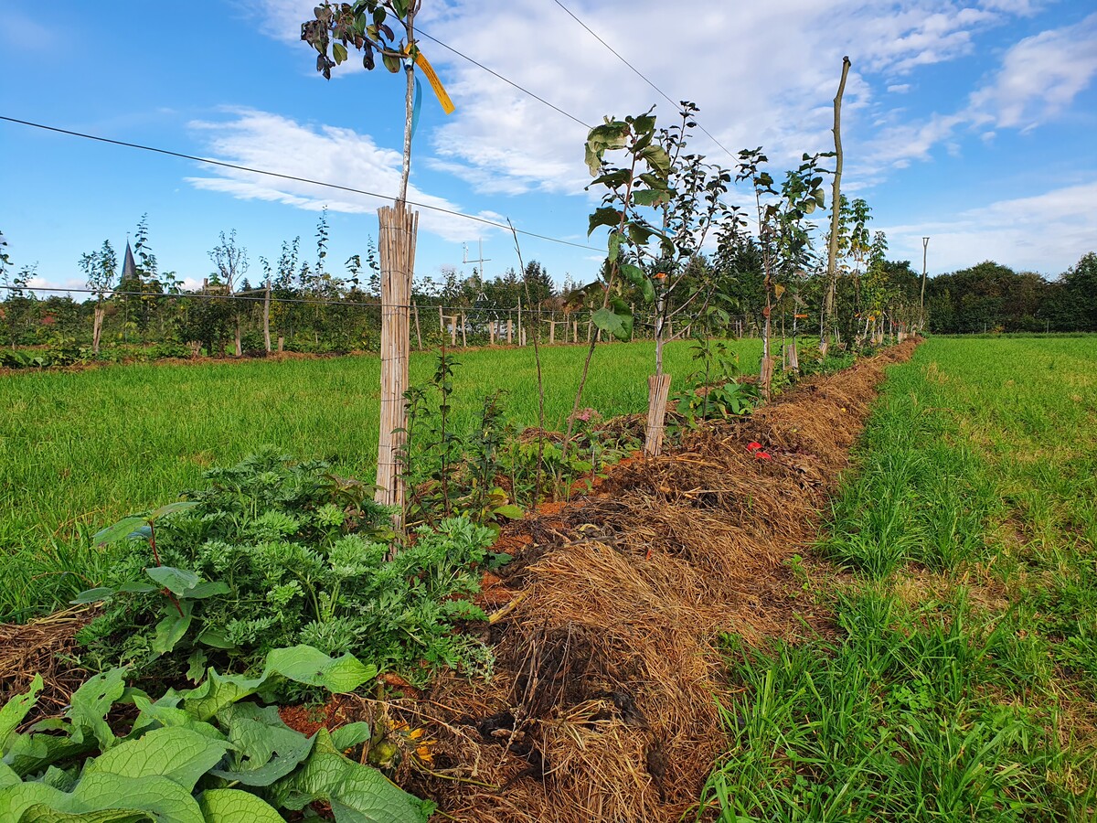 Den Bäumen hat er krautige Pflanzen an die Seite gestellt, die die zarten Sämlinge zu Beginn beschatten – darunter Artemisia, Fingerhut und Sonnenblumen. „Das sind außerdem gute Mykorrhizierer“, erklärt de Vries. Vieles, was der Agroforstplaner tut, ist auf den Boden und seine Lebewesen ausgerichtet. Die Kleegrasmischung zwischen den Baumreihen wird zweimal im Jahr an die Bäume geschwadet. „Kohlenstoffaufbau passiert so gut nebenbei“, bemerkt Bösel. Die Mulchschicht vermindert die Evaporation und schützt die Organismen im Boden vor Hitze und UV-Strahlung. „In unseren europäischen Böden sind genug Nährstoffe vorhanden. Sie müssen nur durch die Mikroben mineralisiert werden. Indem wir so komplexe Systeme pflanzen und die Mikrobiologie fördern, brauchen wir langfristig keinen Input“, ist de Vries sicher. Den Boden aktiv mit Phosphatdünger zu versorgen, hält er deshalb für überflüssig.