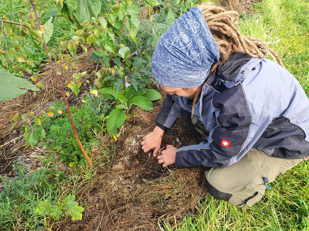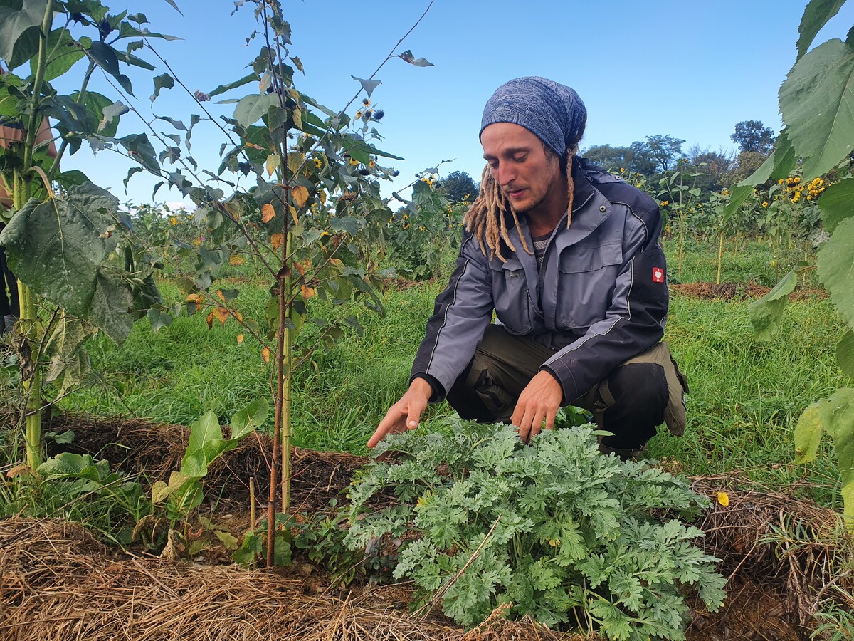 Hinter den komplexen Agroforstanlagen steckt Renke de Vries, der als Forstwirt, Gärtner und Baumpfleger reichlich Erfahrung mitbringt. Das, was de Vries, Bösel und ihr Team aufbauen wollen, sind multifunktionale, syntropische Systeme, die ein natürliches Ökosystem imitieren und sich durch die vielfältigen internen Wechselbeziehungen selbst am Leben halten sollen. Die Schichten – Wurzelgemüse, krautige Pflanzen, Büsche und Bäume – ermöglichen im besten Fall vier Ernten pro Jahr und begünstigen sich gegenseitig, indem sie sich und die Bodenorganismen vor Sonne und Austrocknung schützen. Das ist im trockenheitsgeplagten Brandenburg bitter nötig.