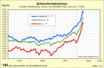 Die kurzfristige Angebotsschwemme vor Ostern dürfte sich allerdings nicht allzu lange fortsetzten, denn insgesamt bleiben die Bestände überschaubar. Zuletzt sind die Jungbullenpreise im Marktgebiet in der KW 14 gegenüber der Vorwoche um 16 ct/kg SG auf im Schnitt 5,73 Euro/kg (E-P) gefallen. Im Norden werden für die laufende Woche nochmals Abschläge von 20 ct/kg SG gemeldet. Bei den weiblichen Kategorien haben die Preise in KW 14 die Spitze erreicht. Schlachtkühe erlösten 4,92 Euro/kg SG (E-P), Färsen 5,33 Euro/kg SG (E-P). Auch hier wurden Tiere zurückgehalten. Der Norden geht für die Karwoche von Abschlägen von 8 bis 10 ct/kg SG aus. Wie groß die Preiskorrektur bei Kühen ausfallen wird, bleibt abzuwarten, zumal das Angebot hier angesichts der steigenden Milchpreise eher knapp bleiben wird. Der Färsenpreis dürfte von der Nachfrage aus der Gastronomie nach dem Wegfall der Corona-Restriktionen gestützt werden.