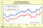 An der Süddeutschen Warenbörse wurde in KW 48 für Bodenhaltungseier 26,75 ct/Ei und für Freilandeier 31,25 ct/Ei notiert (Abgabepreise an den Einzelhandel, Größe L, Abnahme 360 Stück, ohne MwSt. und ohne KVP). Für die Eierproduzenten haben sich die Kosten enorm erhöht. Legehennenfutter kostet im November in Baden-Württemberg 53,0 €/dt (Vj. 40,50 €/dt). Auch die Kostensteigerung bei Energie, Löhnen sowie Verpackungsmaterial verteuern die Produktion. Entsprechend denken Produzenten darüber nach, aus Bio auszusteigen, auf im Ausland erbrütete Junghennen mit Kükentöten und auf die Lieferung an die Industrie umzustellen.