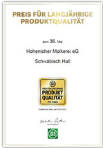 Die Hohenloher Molkerei eG aus Schwäbisch Hall wurde vom Testzentrum Lebensmittel der DLG (Deutsche Landwirtschafts-Gesellschaft) zum 36. Mal mit dem „Preis für langjährige Produktqualität“ geehrt.