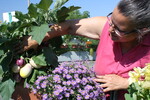Auberginen, Paprika und Chilischoten im Miniformat pflückt Barbara Schmitt (im Bild mit der Miniaubergine „Pinstripe“) von der Bayerischen Landesanstalt für Weinbau und Gartenbau (LWG) in Veitshöchheim auch jetzt im Oktober. Auch an den Monatserdbeeren hängen noch immer süße Früchte. Lediglich die kleinwüchsigen Balkontomaten sehen jetzt nicht mehr gut aus: „Sie sollten den ganzen Sommer unter einem Dach stehen, um sie vor der Kraut- und Braunfäule zu schützen“, empfiehlt Schmitt.