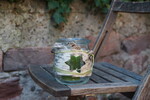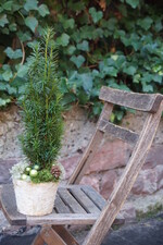 Selbstverständlich können auch ausrangierte Übertöpfe oder Dosen mit diesem schlichten Material beklebt werden. Der eigenen Fantasie sind natürlich keine Grenzen gesetzt. Ein Stück frische Steckmasse in den Topf füllen und einige Eibenzweige so einstecken, dass es wie ein kleines Bäumchen daherkommt. Die Steckmasse am Ende mit Moos und Kugeln abdecken und schon hat man eine schöne Fensterdekoration. Stellt man zwei oder drei nebeneinander oder in Kombination mit den Windlichtern, wird die Wirkung noch gesteigert.