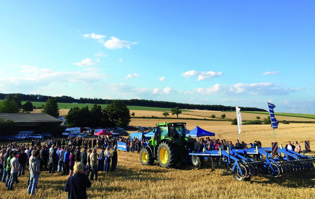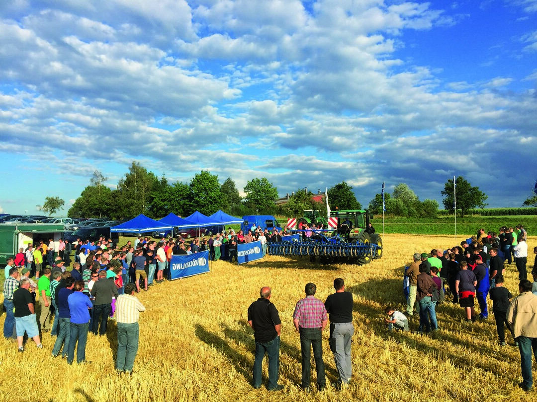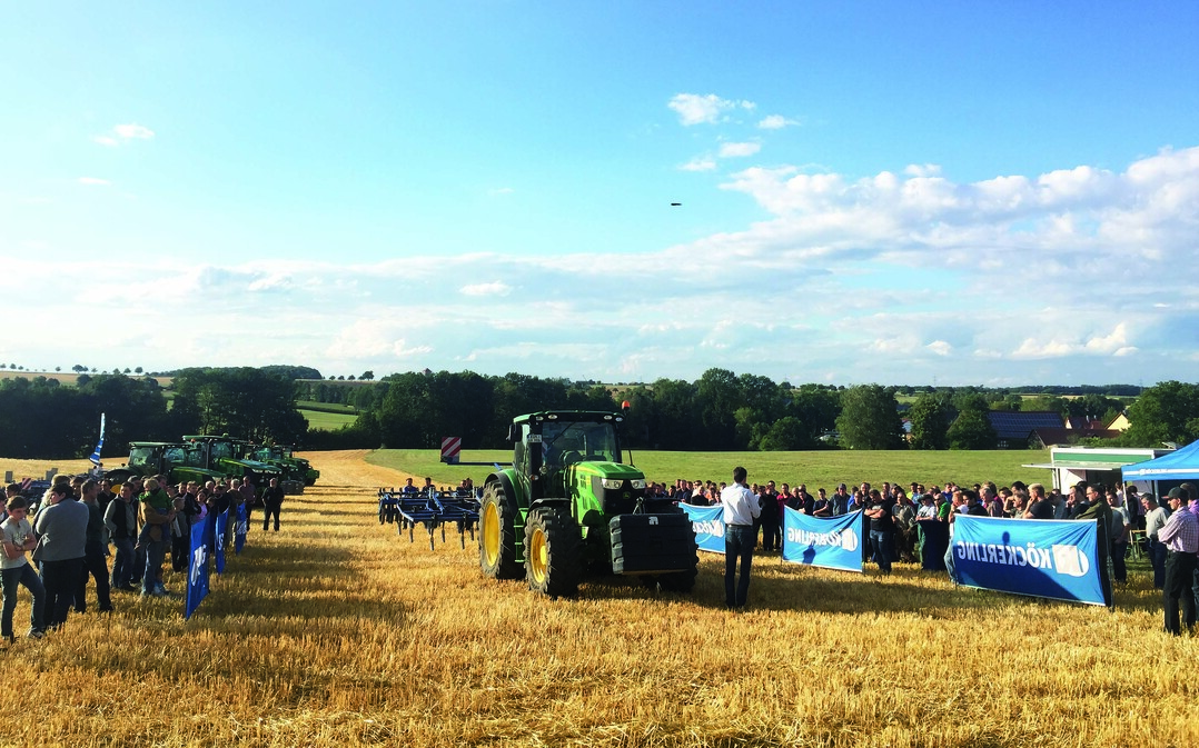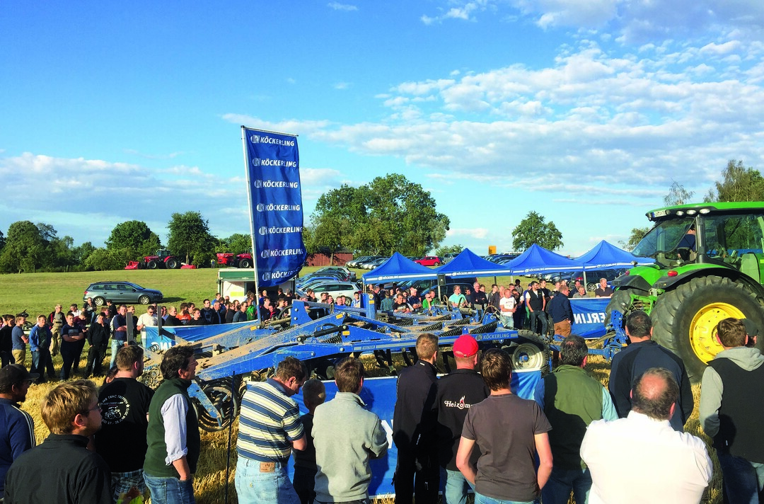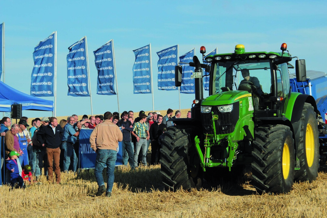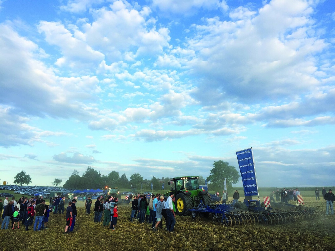 Zunächst wurden die Maschinen in einem großen Vorführring präsentiert. Dabei wurden dem Publikum nicht nur die Neuheiten vorgestellt, sondern auch die technischen Details der bereits seit einigen Jahren im Verkauf befindlichen Maschinen erläutert. Im Anschluss an die Maschinenpräsentation wurden alle Geräte live im Feld eingesetzt. Zahlreiche Landwirte nutzen die Gelegenheit, um auf den Traktoren mitzufahren und sich von der Leistungsfähigkeit der neuen Maschinen zu überzeugen. Insbesondere der neue Traktor 6215R von John Deere und die Zinkensämaschine Ultima von Köckerling sind auf großes Interesse beim Publikum gestoßen. Hier nutzen viele Besucher auch die Chance, Fachgespräche mit Vertretern der Maschinenhersteller auf dem Feld zu führen. Während die Maschinen bis in die Dunkelheit hinein auf dem Acker gearbeitet haben, wurden den Landwirten am Feldrand nicht nur weitere Informationen, sondern auch Verpflegung und Getränke angeboten. In geselliger Atmosphäre entwickelten sich viele angeregte Gespräche rund um die moderne Technik für den Ackerbau.