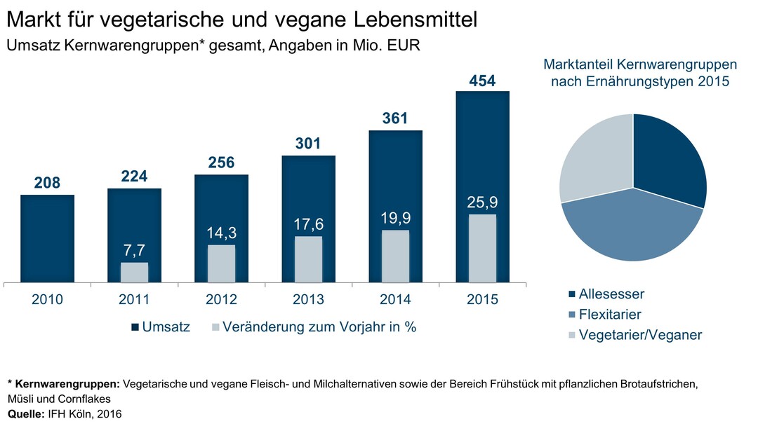 Insbesondere die drei umsatzstärksten Warengruppen – vegetarische und vegane Fleisch- und Milchalternativen sowie der Bereich Frühstück mit pflanzlichen Brotaufstrichen, Müsli und Cornflakes – konnten in den vergangenen fünf Jahren ein deutliches Umsatzplus generieren: Die durchschnittliche jährliche Wachstumsrate lag bei fast 17 Prozent. Damit lag das Marktvolumen für diese drei Warengruppen 2015 bei 454 Millionen Euro. Die größte Dynamik zeigten dabei Molkereialternativen, wenn auch auf kleinem Niveau, gefolgt von Fleischalternativen. Auch andere Warengruppen, die bis dato nur für wenige Konsumenten interessant waren, wie vegane Säfte und Weine, sind seit kurzer Zeit im Aufschwung. Dieses Wachstum wird sich laut IFH-Prognosen auch in den kommenden Jahren fortsetzen.