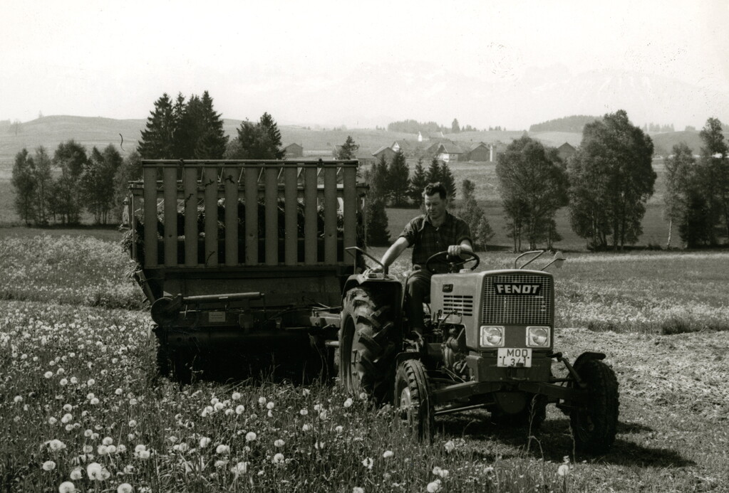 Der Fendt Farmer 1E mit 30 PS sei ein idealer Mähschlepper wirbt Fendt Ende der 60-er Jahre für den Traktor. Im Bild wird das Grüngut in einem Arbeitsgang gemäht und aufgeladen.