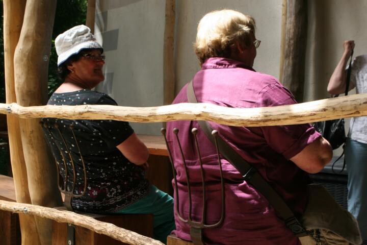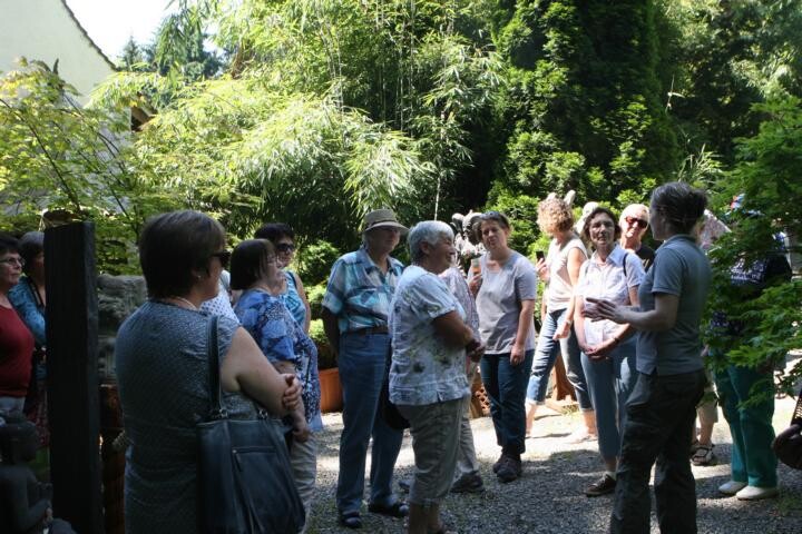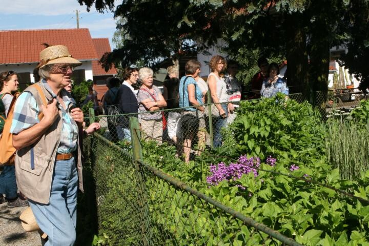 Schon die Anfahrt nach Herdwangen-Oberndorf weckte die Neugierde auf die Gärten und ihre Besitzer, berichtete Reiseleiterin Rita Goller doch von so mancher Anekdote mit den Beteiligten bei der Festlegung der diesjährigen Tour, an der an vier Tagen insgesamt 150 Besucherinnen teilnahmen. Auf dem Bioland-Betrieb der Familien Wanke und Kelly angekommen, wartete ein zweites Frühstück auf die Besucherinnen. Das Besondere: Nicht Bohnenkaffee, sondern ein Röstkaffee aus Lupinen und damit aus einer auf dem Betrieb angebauten Fruchtart konnte verkostet werden. Dazu hatte Johanna Warnke ein Zopfbrot gebacken, für das sie viel Lob einheimsen durfte. Auch die verschiedensten Fruchtaufstriche aus Wildfrüchten mundeten den Besucherinnen.