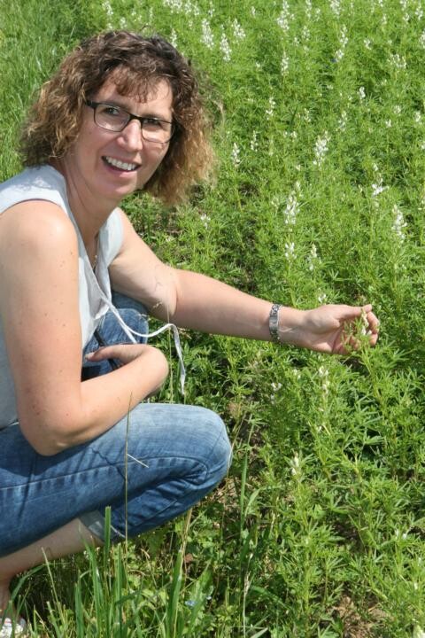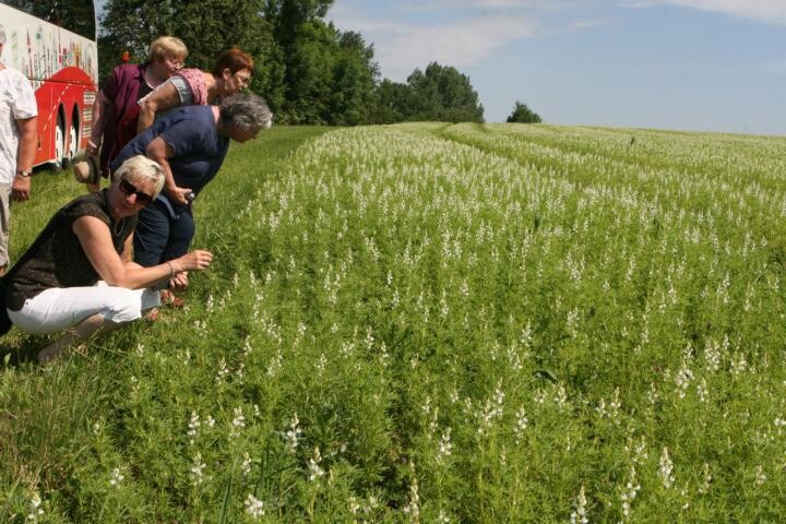 Seit zwei Jahren baut Tochter Linda Kelly die Blaue Süßlupine an. Der Name ist trügerisch, erstrahlt ihre Blüte doch in reinstem Weiß. Eingestiegen ist sie in den Anbau vor zwei Jahren, mittlerweile stehen die Lupinen auf 2,8 Hektar. „Es ist ein Produkt, das wirklich Spaß macht“, berichtet sie über Anbau und die Vermarktung unter der Dachmarke Lupinello. Der daraus in handwerklicher Arbeit hergestellte und geröstete Kaffee ist koffein- und glutenfrei und damit bekömmlicher. Ende August/Anfang September steht die Ernte der im April gesäten Lupinen an, wenn‘s gut läuft mit einem Ertrag von 20 dt/ha. Auf dem Weg zum Röstkaffee werden die Lupinen maschinell vorgereinigt, handverlesen, schonend geröstet und dann gemahlen. Doch Achtung: Wer glaubt, das auch mit seinen Gartenlupinen testen zu können, den warnt Linda Kelly schon mal vorsorglich. Während der Ackerkultur nämlich der Bitterstoff herausgezüchtet wurde, besitzen diese die Gartenlupinen noch, was sie nicht nur unbekömmlich, sondern auch giftig macht.