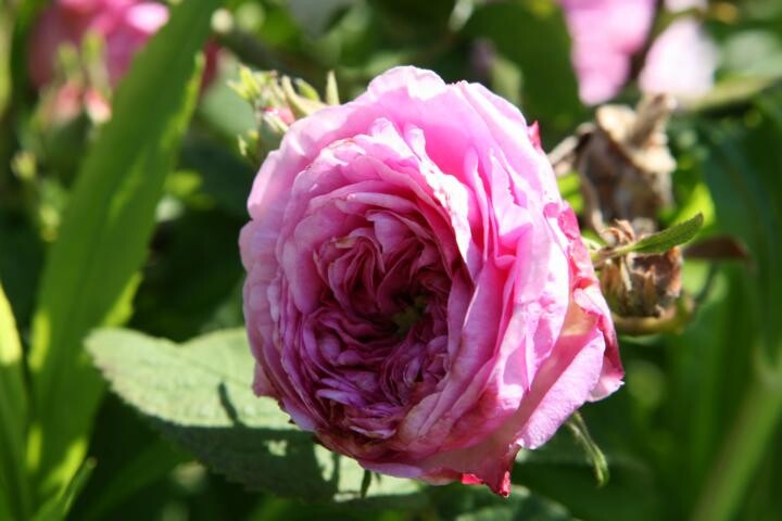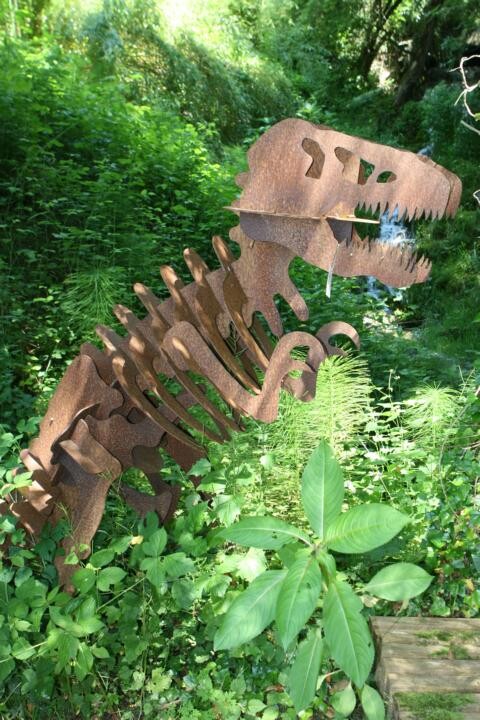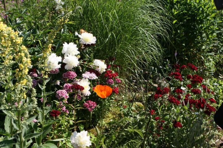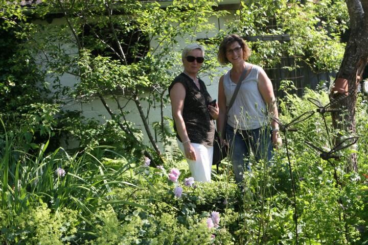 In ganz unterschiedliche Gartenecken konnten die Besucher im weitläufigen Areal bei Familie Jauch in Blönried eintauchen. Hochstammbäume wechselten mit Staudenbeeten und als besonderes Highlight eröffnete sich im hinteren Gartenteil plötzlich der Blick auf einen bis zu vier Meter tiefen Schwimmteich, in dem Frösche aus Herzenslust quakten. Vor 33 Jahren hat Ulrike Jauch mit der Anlage begonnen. Heute umfasst der Garten 3000 Quadratmeter und wird durch weitere 2000 Quadratmeter Gemüsegarten auf der anderen Straßenseite ergänzt. "Sträucher habe ich kaum, ich liebe den freien Blick auf meine Pflanzen", begründet die leidenschaftliche Gärtnerin, deren besondere Liebe historischen Rosen gehört. Im ganzen Garten finden sich Hingucker, die teils zum Schmunzeln einladen, teils auch hintersinnige Gedanken aufkommen lassen. Hand angelegt hat Ulrike Jauch dabei selbst, meist aus Materialien, die nicht mehr anders zu gebrauchen waren. Ferner hat sich die Künstlerin mit Filzprodukten einen Namen gemacht.