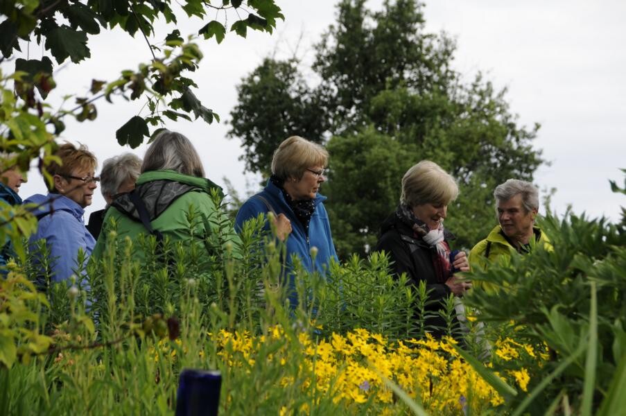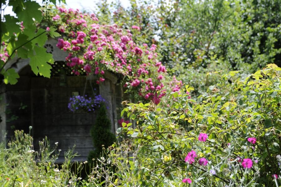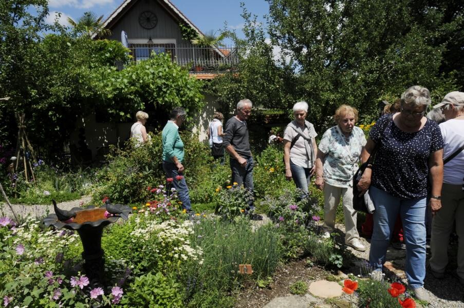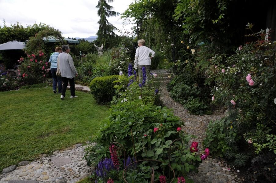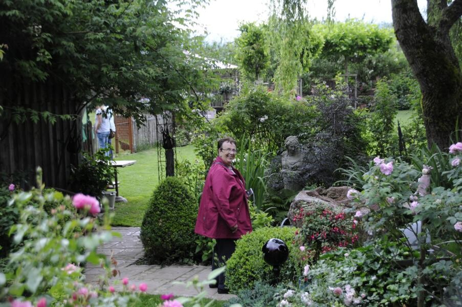 Ihren Abschluss fand die Gartenfahrt dann bei Kaffee und Kuchen im privaten Rosenparadies von Andrea Heckmann. Auf 735 Meter Höhe wachsen die prächtigsten Rosen in einem romantischen Garten mit spektakulären Ausblicken in die Westallgäuer Landschaft und den Bregenzer Wald. Die meisten Rosen im Garten gehören zu den Alten Rosen, die zu beeindruckenden Büschen herangewachsen sind. Die einmal blühende „Constanze Spry“ hat eine Seite des Hauses bis zum Dachfirst erobert und hüllt die ganze Terrasse mit ihrem würzigen Myhrreduft ein.