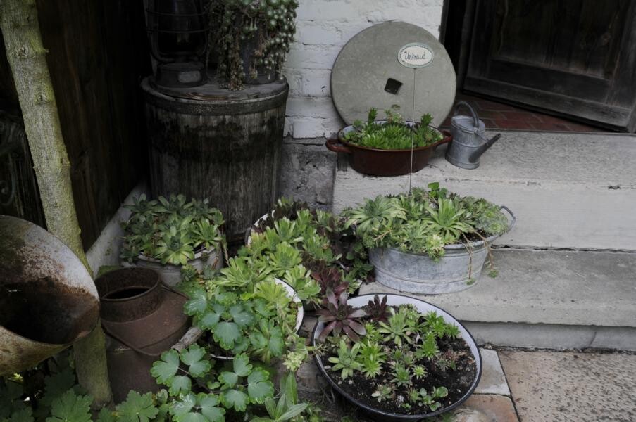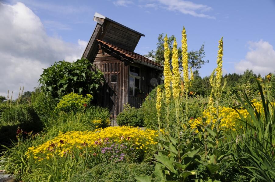 Elke Zimmermann und Michael Nickel übernahmen einst das alte Bauernhaus der Großeltern und gestalteten das umliegende Gelände nach ihren Plänen um. Heute haben sie einen Garten, der gestaffelt auf unterschiedlichen Höhen mit verschiedenen Terrassen, Trockenmauern, Bauerngarten und einem Gartenteich beeindruckt. Ihren Lieblingsblumen, den Iris, haben die studierten Gartenbauer einen eigenen Gartenteil reserviert. Weitere Favoriten sind Pfingstrosen und Frauenmantel, aber auch Tulpen und Rosen. Verschiedene Sitzplätze eröffnen immer wieder neue Blicke in das Allgäuer Hügelland.