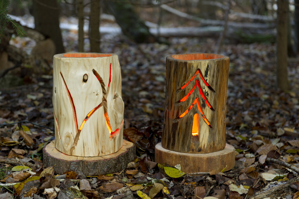 Damit das Licht aus dem Inneren auch nach außen scheinen kann, werden Lichtschlitze ins Holz gesägt.
