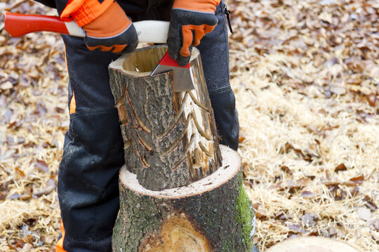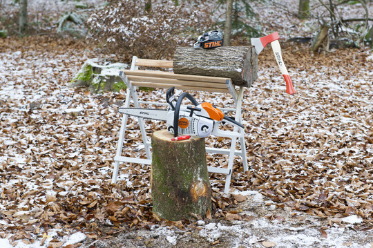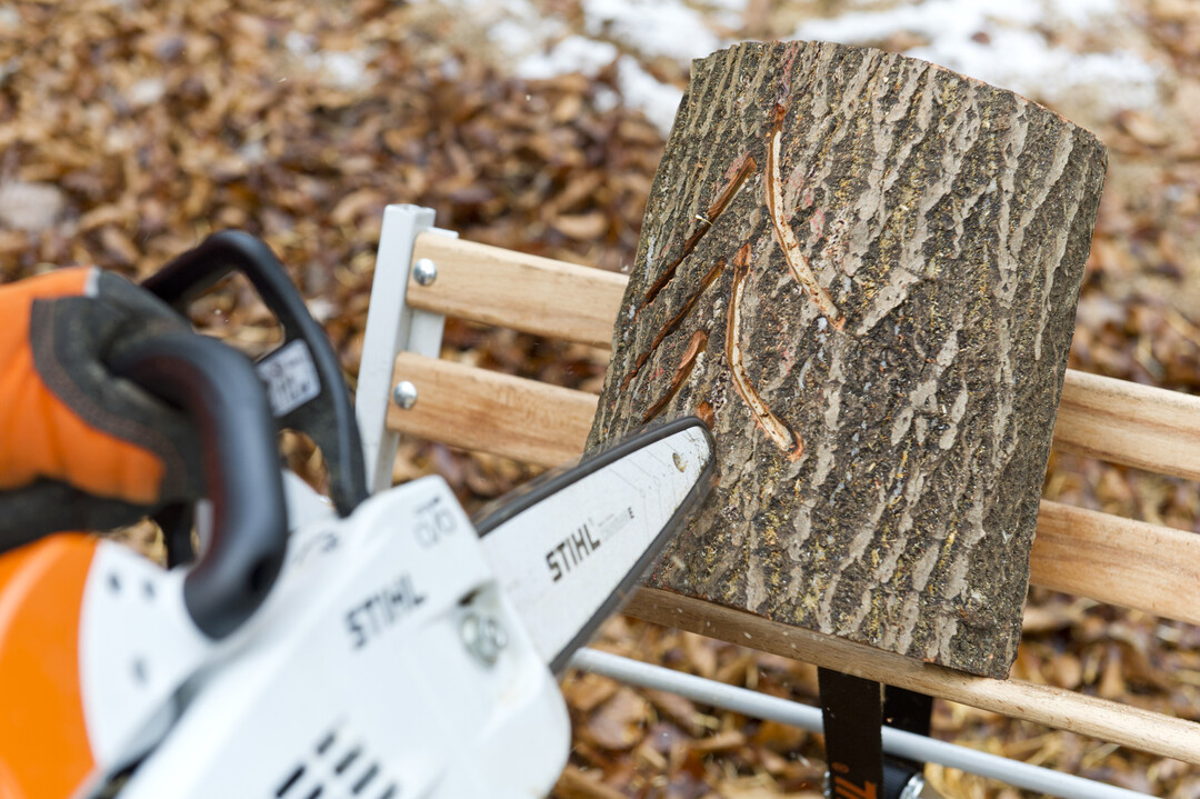 Zudem benötigt man einen Sägebock mit Spanngurt, ein Beil, Kreide zum Markieren, die persönliche Schutzausrüstung und selbstverständlich eine Motorsäge mit Carving-Schneidgarnitur. Sie ist bestens geeignet, wenn es um feine Arbeiten mit und am Holz geht.