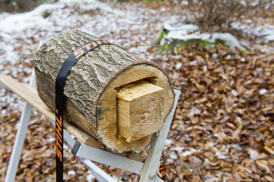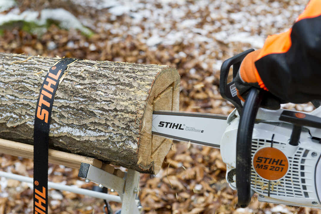 Bevor Sie mit der Motorsäge loslegen, fixieren Sie das Rundholz fest auf einem Sägebock. Am besten eignet sich hierfür ein Spanngurt. Mit einem Stück Kreide zeichnen Sie nun die ersten Schnitte vor – so haben Sie einen klaren Ansatzpunkt für die Säge.