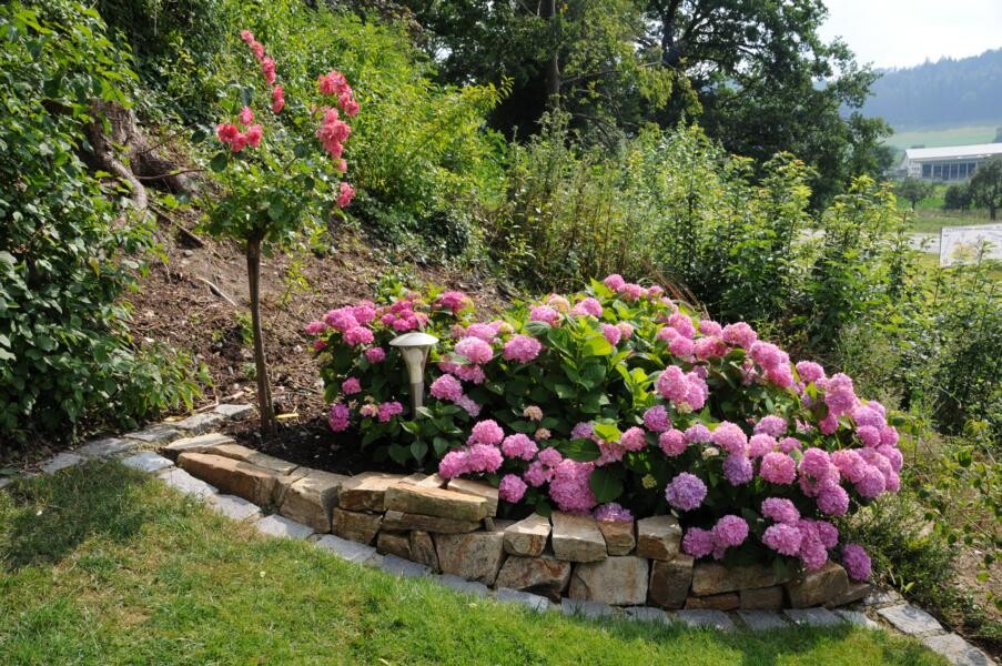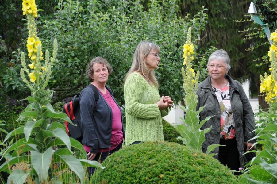 Inge Degenhardt in Sigmaringen-Laiz steht bereits wartend in der Einfahrt, als der Bus mit knapp 50 Frauen – alles begeisterte Gärtnerinnen – anrollt und lädt herzlich ein, einen Blick in ihren privaten Garten zu werfen. Es ist eine Kombination aus Nutz- und Ziergarten. Viel Leidenschaft steckt sie in Gemüsegarten und Beerensträucher. Der Teich, der lange Zeit eine schattige Ecke im Garten domierte musste vor ein paar Jahren einem Sitzplatz unter der üppigen Trauerweide weichen. An dem heißen Sommertag ein begehrter Platz der Gartenfahrten-Teilnehmerinnen.