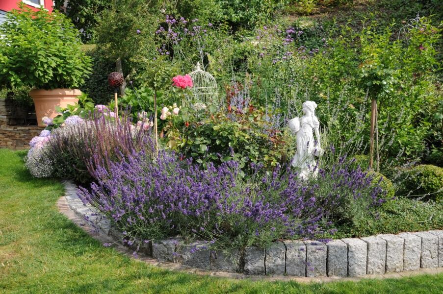 Kontrastreich dazu ist der Garten von Sigrid Wolf, der nur wenige Meter weiter zu finden ist. Die passionierte Gärtnerin hat sich zahlreiche Sitzecken geschaffen und jüngst sogar einen Bachlauf. Insektenweide für große und kleine Tiere zu sein, ist Sigrid Wolf ein wichtiges Anliegen. Zahlreiche Schmetterlinge tanzen über den duftenden Tagetes und weiteren Stauden. Auch hier finden Beerengarten und Gemüse ihren Platz. Besondere Leidenschaft sind jedoch die fein geschnittenen Buchsbüsche. Ob Kegel oder Ornamente – ein echter Hingucker.