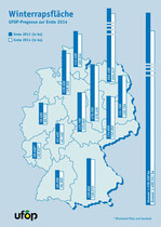 Auf Grundlage einer aktuellen Befragung von 5.011 Landwirten im September/ Oktober 2013 schätzt das von der Union zur Förderung von Oel- und Proteinpflanzen (UFOP) beauftragte Marktforschungsunternehmen Produkt+Markt die Winterrapsanbaufläche zur Ernte 2014 auf 1,4 Millionen Hektar. Im Vergleich zur Erntefläche 2013 bedeutet dies einen leichten Rückgang des Anbaus von Winterraps um bundesweit -4 Prozent (-57.959 Hektar). Die Anzahl der rapsanbauenden Betriebe zur Ernte 2014 sinkt um -1,3 Prozent. Leichter Rückgang der Fläche Damit ergibt sich ein Rückgang der Fläche gegenüber dem für Raps sehr günstigen Vorjahr. Der Anbau bleibt aber in etwa auf dem Niveau der Jahre vor den zwei witterungsbedingt schwierigen Saisons 2011 und 2012....