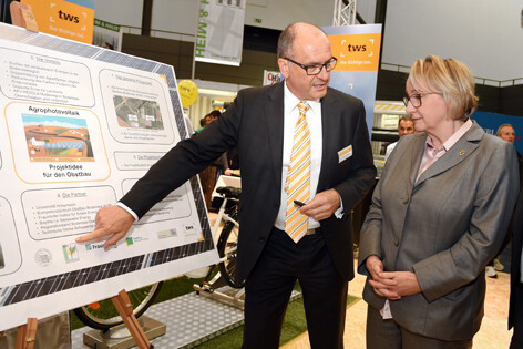 Dr. Andreas Thiel-Böhm, Geschäftsführer der Technischen Werke Schussental (TWS) erläuterte die Idee, die hinter dem Projekt steht: Sieben Partner wollen herausfinden, unter welchen Bedingungen sich Apfelbäume unter Photovoltaik-Anlagen wohl fühlen und welche Wechselwirkungen an Ort und Stelle zwischen der Stromerzeugung und dem Erwerbsobstbau entstehen. Die TWS klärt als Projektpartner sowohl die energiewirtschaftlichen Fragen als auch die betrieblichen Fragen zur Photovoltaik unter den Bedingungen des Obstanbaus. „Das Projekt bietet enormes Potenzial für unsere Region. Denn es geht um eine sinnvolle Doppelnutzung von Agrarflächen, die gleichzeitig den Klimaschutz voranbringt“, sagte Andreas Thiel-Böhm.
