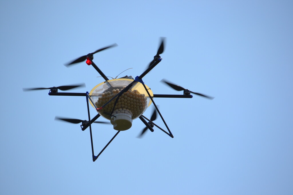Einsatz bei der Ausbringung von Zwischenfruchtmischungen in noch stehende Bestände, beispielsweise bei Soja. Die Firma Dialogis hat dazu ein Streu-UAV (=unbemanntes Fluggerät) entwickelt und stellt es zu Tests zur Verfügung. Es kann auch mit Granulat oder Vergrämungsmitteln beladen werden.