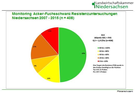 Das Ergebnis ist sehr erschreckend: Ein Drittel der untersuchten Proben zeigt in Niedersachsen keine ausreichende Wirkung mehr für die Wirkstoffgruppe der DIM (z.B. Select 240 EC und Focus Ultra). Die Gruppe der FOP (dazu gehören Herbizide wie z.B. Ralon, Ralon Super, Topik 100) zeigt im niedersächsischen Resistenzmonitoring, dass nur ca. 7 % der Proben eine sensitive Wirkung haben. Eine ausreichende Bekämpfung von Ackerfuchsschwanz ist mit dieser Wirkstoffgruppe demnach alleine weder auf den Marschböden noch auf den typischen Ackerfuchsschwanzstandorten im Binnenland möglich. Auf mehr als 400 Standorte mit Ackerfuchsschwanz wurde eine ALS-Resistenz untersucht und in mehr als 50 % der Proben bestätigt. Besonders die Fälle mit absoluter Target-site Resistenz (TSR) nehmen zu, mittlerweile sind hier 25 Ackerfuchsschwanzstandorte betroffen. Anders ausgedrückt: von den insgesamt 200 gegenüber ALS-Hemmer als resistent befundenen Ackerfuchsschwanzstandorten, sind 12 % nicht mehr mit ALS-Hemmern wirksam bekämpfbar.