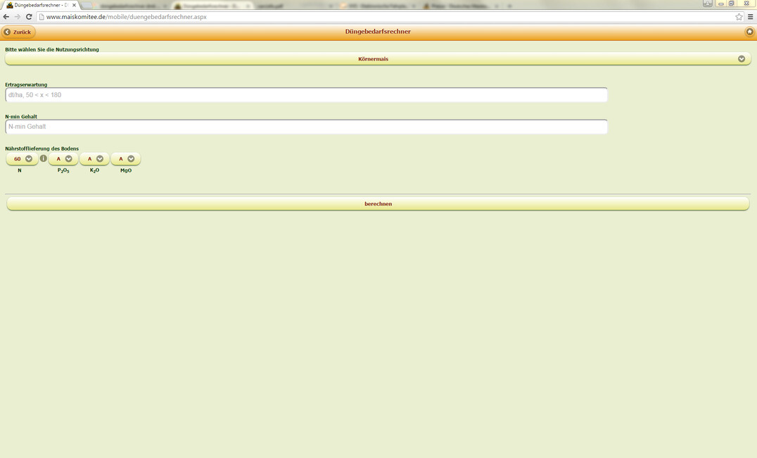 Der Düngebedarfsrechner unterscheidet zwischen Körner- und Silomais. Auf der Basis des angestrebten Ertrages und des Wertes der Nmin-Untersuchung, die der Landwirt individuell eingibt, errechnet das Programm den Nährstoffentzug des Bestandes und zeigt dem Landwirt die benötigte Höhe der Ausgleichsdüngung für Stickstoff, Phosphat, Kali und Magnesium an. Die Ergebnisse dienen als Hinweis auf den Nährstoff- und Düngebedarf im Maisbestand, denn die Landwirte müssen bei der Bewertung der Daten auch die Effekte einer eventuellen, langjährigen organischen Düngung berücksichtigen.
