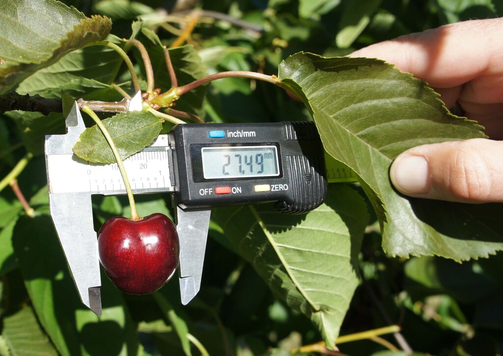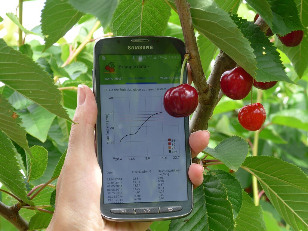 Dicker wird’s nimmer – so ließe sich interpretieren, was Kirschenproduzenten künftig auf ihrem Smartphone-Display ablesen können. Die App Cherry Harvest Size errechnet aus wiederholt gemessenen Fruchtgrößen von Süßkirschen deren Wachstumsrate – also den täglichen Zuwachs. Mit Hilfe der Wachstumsrate lässt sich das optimale Erntedatum besser bestimmen als allein anhand der Fruchtgröße. Solange die Wachstumsrate hoch ist, können die Früchte noch am Baum bleiben und weiterwachsen, denn große Früchte erzielen höhere Verkaufspreise. Fällt die Wachstumsrate unter einen bestimmten Wert, sollten die Früchte aber so schnell wie möglich geerntet werden. Konkret heißt das: Der Obstbauer misst die Größe einer Reihe von Kirschen aus seiner Anlage und gibt diese Werte in die App auf seinem Smartphone ein. Die App berechnet die mittlere Wachstumsrate des Fruchtdurchmessers. Fällt diese unter 0,2 mm pro Tag sollten die Kirschen baldmöglichst geerntet werden, denn über einen Zeitraum von fünf Tagen würden die Früchte dann nur mehr um einen Millimeter wachsen. Ein so geringer Zuwachs rechtfertigt kaum das Risiko, die Kirschen währenddessen durch ungünstige Bedingungen, Regen, Krankheiten oder Schädlingsbefall zu verlieren.