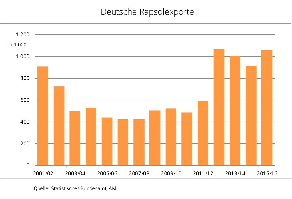 Die Rapsölexporte Deutschlands sind laut Statistischem Bundesamt 2015/16 deutlich gestiegen. Mit rund 1,1 Mio. t wurden fast 16 % mehr ins Ausland verkauft als 2014/15. Davon gingen 91 % in andere EU-Staaten und damit etwa 3 % weniger. Die Niederlande, als Drehscheibe des internationalen Handels, waren mit 484.000 t und demzufolge einem Plus von 7 % erneut die Hauptabnehmer. Mit der um 53 % auf 157.000 t gestiegenen Importmenge folgt Polen. Auf Platz drei der Hauptempfänger landete, trotz eines erheblichen Importrückgangs, Belgien mit 87.000 t. Nach Angaben der Agrarmarkt Informations-Gesellschaft mbH erhielten die EFTA-Staaten (Island, Norwegen, Schweiz) mit 78.000 t derweil eine Rekordmenge.