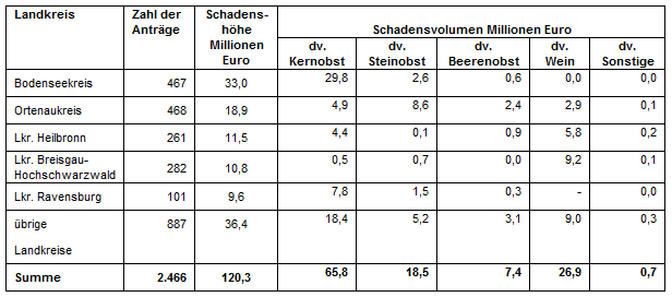 „Regional am stärksten betroffen waren der Bodenseekreis mit 467 Anträgen und einem beantragten Schadensvolumen von 33 Millionen Euro, gefolgt vom Ortenaukreis mit 18,9 Millionen, dem Landkreis Heilbronn mit 11,5, dem Landkreis Breisgau-Hochschwarzwald mit 10,8 und dem Kreis Ravensburg mit 9,6 Millionen Euro“, erklärte der Minister.