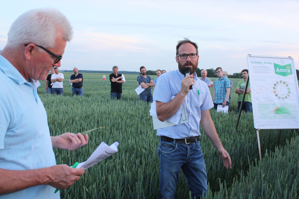 Hauptinfektionszeitpunkt von Septoria und DTR-Blattdürre war im Winterweizen-Versuchsfeld Mitte Mai, punktuell tritt Gelbrost auf. Auf der Intensivvariante wurde auf den Winterweizen Input Classic 0,8 l/ha ausgebracht, im Stadium EC 37-39 in etwas reduzierter Menge 1,25 l/ha Ascra Xpro, dem nun in der Region in aller Kürze in die Blüte 1l/ha Prosaro folgt. Variante 2 besteht aus einer einzigen Blattbehandlung mit 1,5 l/ha Ascra Xpro und zu Variante 3, der Standardmaßnahme für die Region, gehört eine frühe Blattbehandlung mit 1,25 l/ha Ascra Xpro und einer Fusariumbehandlung 1l/ha Prosaro zur Blüte, vor allem nach Mais. Wer bisher noch gar keine Fungizidmaßnahme ergriffen hat, dem hat Rudi Glück SkywayXpro mit dauerhaftem Blattschutz undTop-Wirkung gegen Fusarium empfohlen. Bei Weizen und Sommergerste sollte bei Überschreitung der Schadschwelle von 0,5 bis 1,5 Hähnchen/Fahnenblatt umgehend etwas gegen Getreidehähnchen unternommen werden.