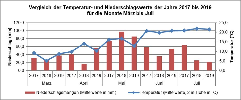 Der Versuch wurde in Bönnigheim bei guten Bedingungen am 29. März mit vorgekeimten Pflanzgut ausgepflanzt. Die Bestände liefen in der dritten Aprilwoche auf, Frostschäden traten nicht auf. Die Jugendentwicklung war zügig, was dazu führte, dass sich die Reihen bereits Ende Mai schlossen. Ausreichende Niederschläge im Mai und Juni sorgten für einen hohen Knollenansatz und ein starkes Krautwachstum. Ein Starkregen in der letzten Juniwoche setzte der Dammstruktur sehr zu, die Folge waren vielfach ergrünte Knollen. Der Schädlingsdruck durch Kartoffelkäfer und Drahtwürmer war hoch.