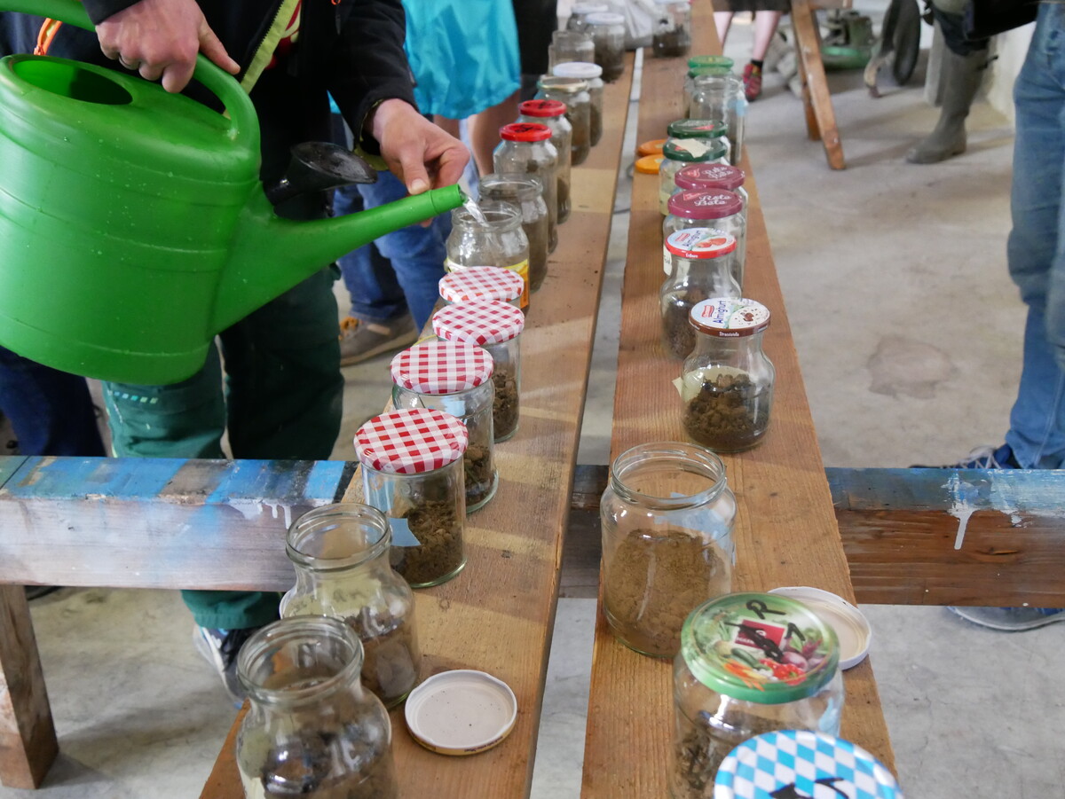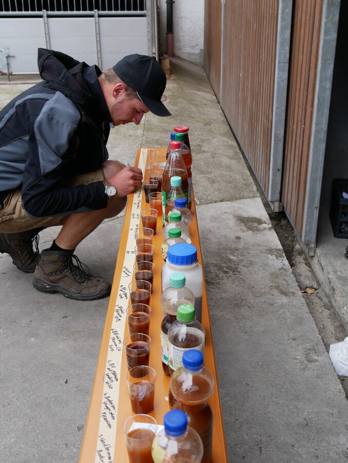 Dann werden gemeinsam Boden-Schwenkproben aus mitgebrachter Erde und im Bodenkurs zugegebenem Wasser beurteilt. „Je trüber, desto mehr nicht in die Bodenaggregate eingebundene Tonmineralien enthält die Probe. Das bedeutet, der Boden ist auswaschungsgefährdet. Je farbiger, desto mehr organische Säuren. Je mehr Schaum, desto mehr mikrobielle Aktivität“, erklärt Wenz. „Das Bodenleben ist Mikrobiologie. Damit muss ich mich auseinandersetzen. Wir lernen in der Ausbildung oft nur Symptombehandlung“, lautet Näsers Abschlussstatement. Wenz beteuert: „Wir haben alle die gleichen Interessen: Wir wollen die Bodenfruchtbarkeit verbessern, um unseren Kindern und Enkeln einen Betrieb zu hinterlassen, von dem sie gut leben können.“