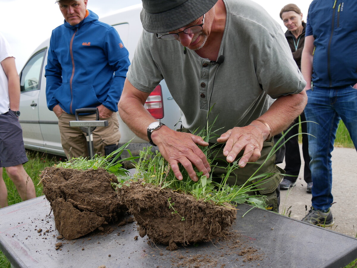 Die Fruchtfolge verbessern und von Chemie wegkommen, den Betrieb unabhängiger machen, die Unkräuter richtig lesen können – So unterschiedlich sind die Motive der Teilnehmer:innen des „Bodenkurs im Grünen“ für Bayern: Aus ganz Südbayern und Baden-Württemberg reisten im Juni 2021 Landwirt:innen nach Epfenhausen bei Landsberg am Lech. Ökologische und konventionelle Betriebe sind darunter und auch drei Biogaserzeuger. Wie jedes Jahr lehren Dietmar Näser und Friedrich Wenz auf Betrieben früherer Kursteilnehmer. Die beiden gelten als die Lehrmeister der regenerativen Landwirtschaft.